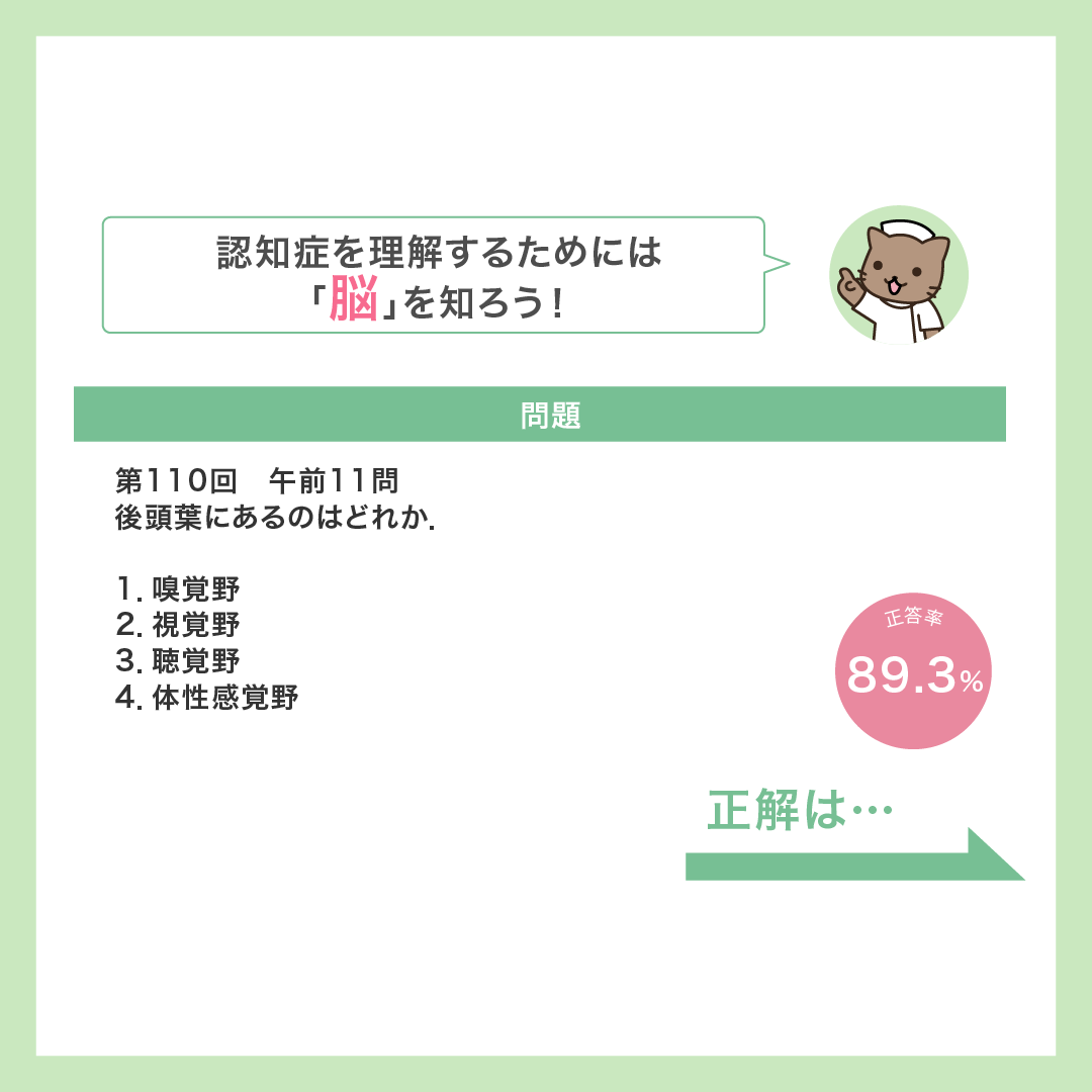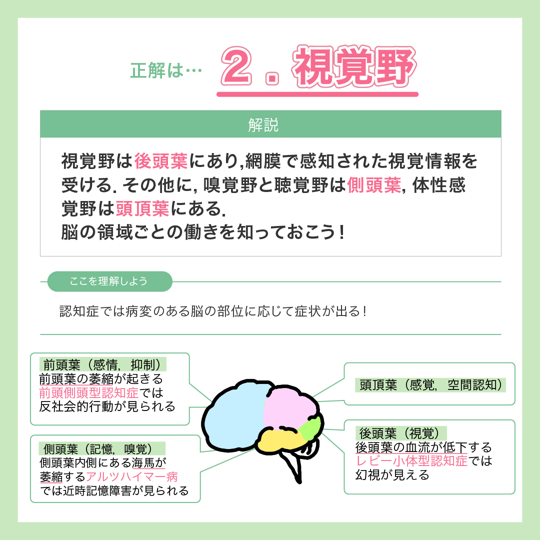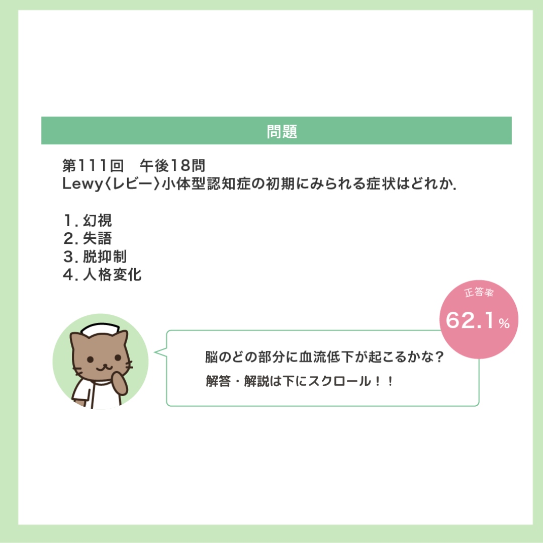 正解は① レビー小体型認知症では,視覚をつかさどる後頭葉に障害が起こっています.後頭葉が障害されると視覚に関する異常が現れるため,視覚にまつわる選択肢を選べばOK! 他の選択肢もどの部位が障害されているか,どの認知症に現れるのか考えてみよう!