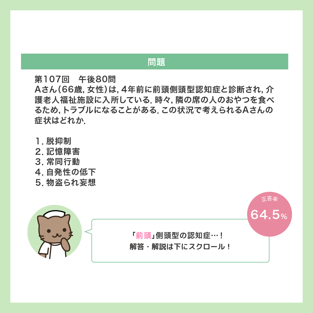 正解は① 思考・判断・感情などの精神行動は前頭葉がつかさどっているため,この部位が障害されると脱抑制などの人格の変化・行動異常が現れます. 前頭側頭型認知症の代表的な症状のひとつである脱抑制では,自己本位的な行動や万引き,盗食などの反社会行動を引き起こすようになります.