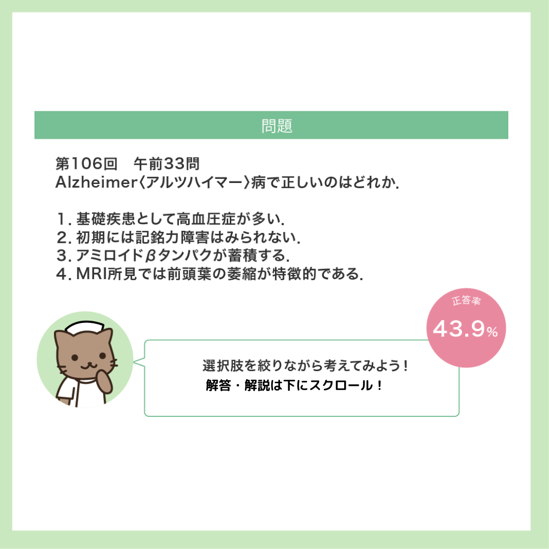 正解は③ アルツハイマー型認知症は認知症のなかで最も多い病型です. 側頭葉の内側面にある海馬とその周辺が記憶の保持や想起に関係しているため,海馬が委縮するアルツハイマー型認知症では近時記憶障害が現れます. 高齢や頭部外傷の既往,アルツハイマー型認知症の家族歴が危険因子であり,アミロイドβ蛋白・タウ蛋白の蓄積が特徴です.