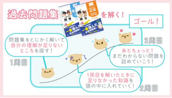 なかでも2周目の「間違えた問題や自信がない問題を振り返って理解する」ことが国試勉強のメインといっても過言ではありません。