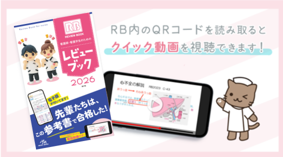 『レビューブック』の各ページの上にあるQRコードを読み取ることで該当ページに関する解説動画を見ることができます。 特に国家試験に問われやすい疾患や治療などは解剖生理に戻って解説しているので、つながった知識を学ぶことができます。