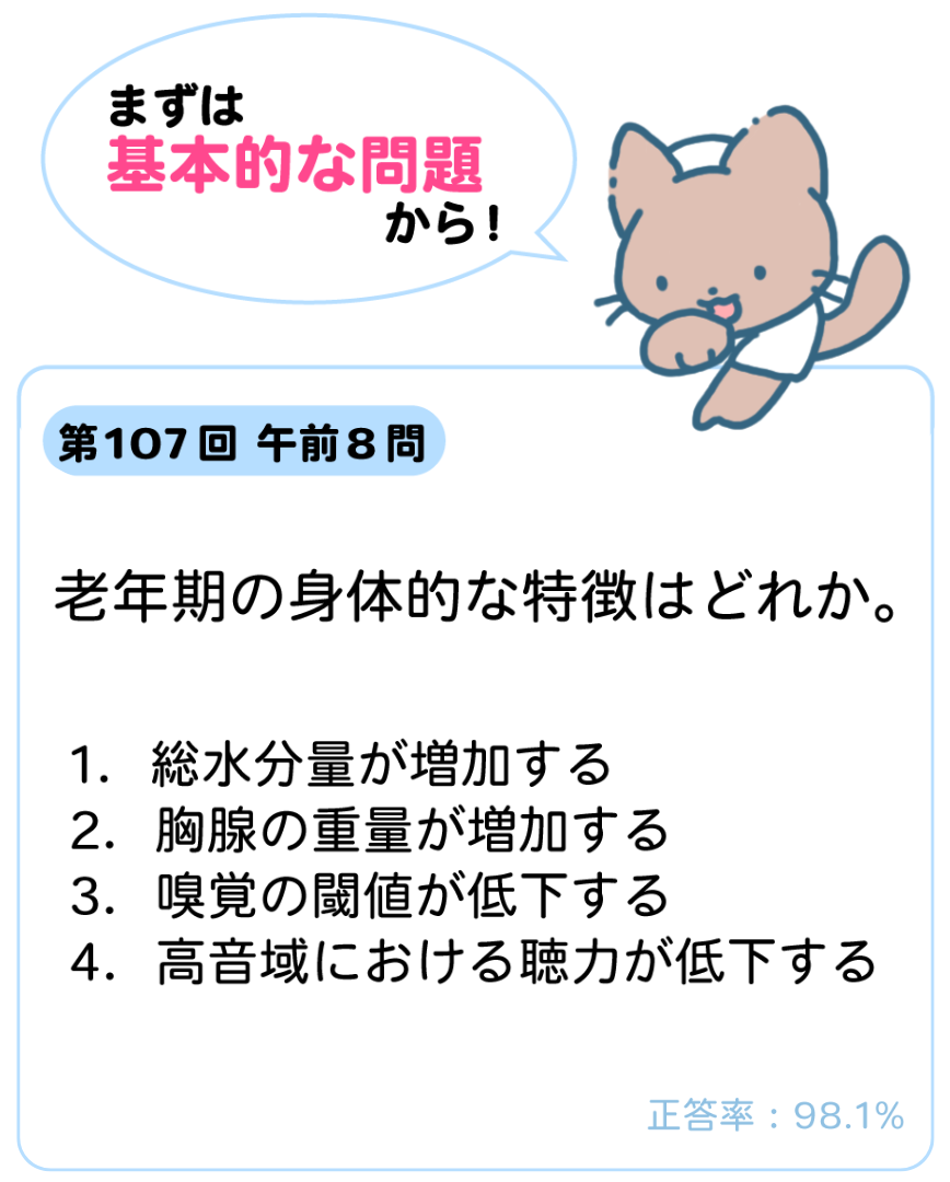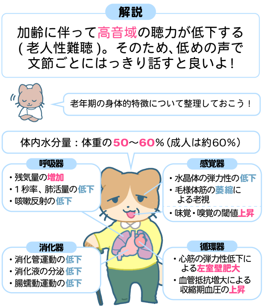 下図の老年期の身体的特徴をしっかり理解して次の問題にも取り組んでみましょう!