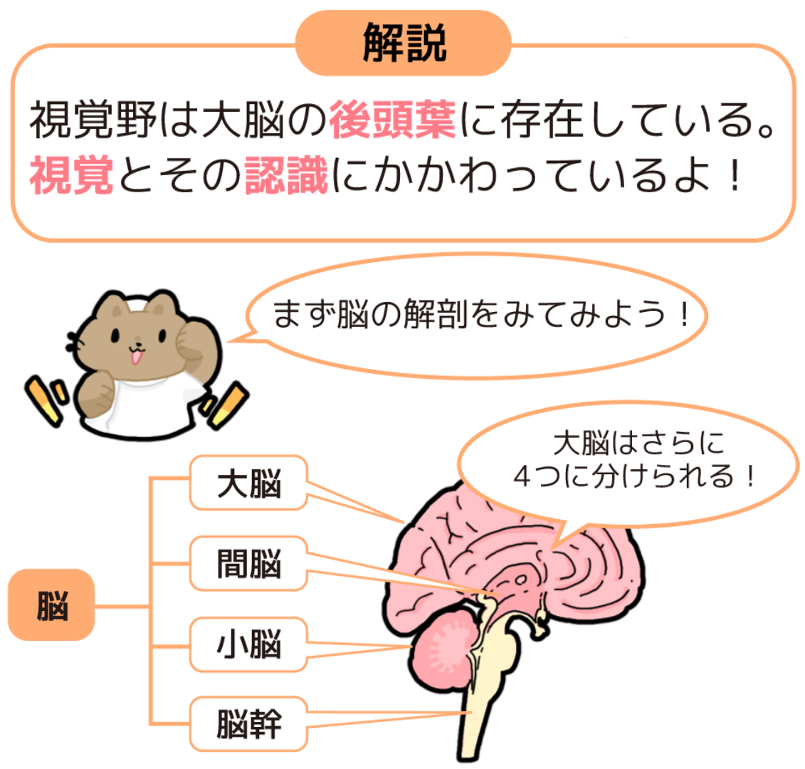 脳は大脳、間脳、小脳、脳幹に分けられます。その中でも脳の大部分を占めている大脳は、解剖学的にさらに4つの脳葉に分けられます。今回出題された後頭葉はそのうちの1つです。それぞれの役割はレビューブック(J-5)または下図をご確認ください。