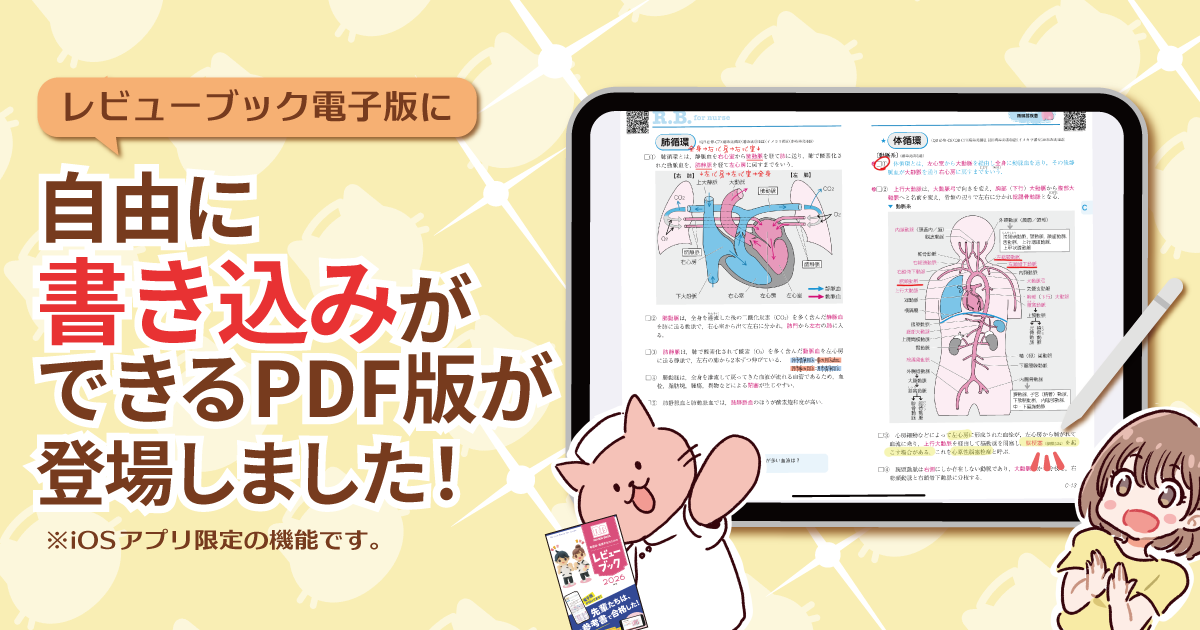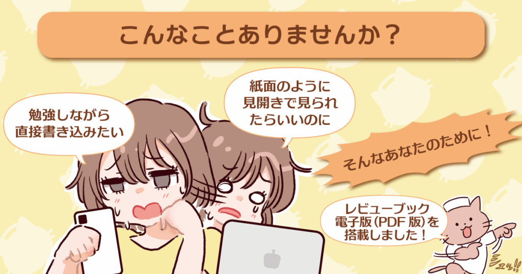 『レビューブック電子版』を使っていたときに、 「勉強しながら直接書き込みたい…」「紙面のように見開きで見られたらいいのに」と思った人はいませんか? そんなあなたのために『レビューブック電子版(PDF版)』を搭載いたしました!