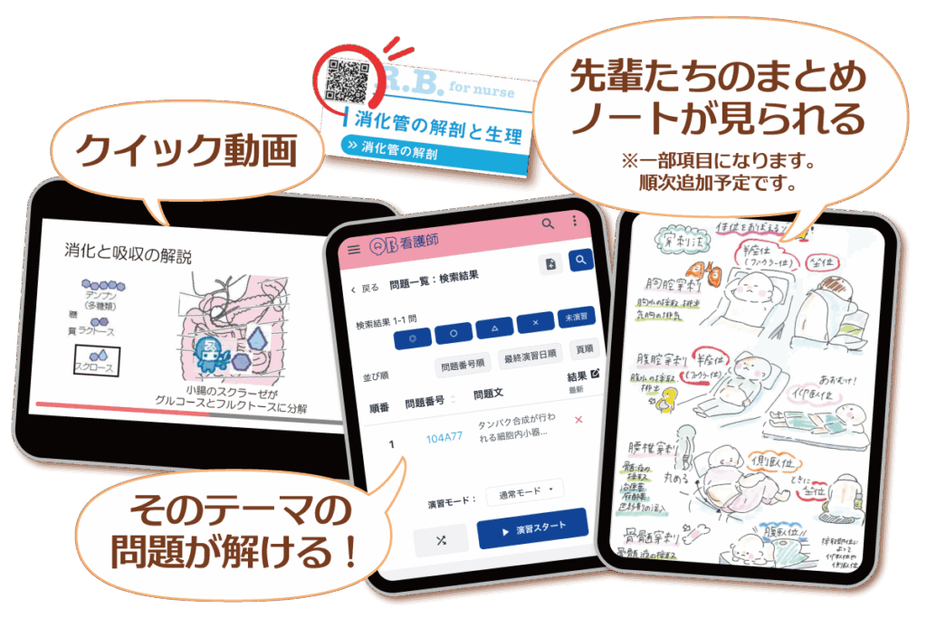※先輩たちのまとめノートは現在13項目(「酸塩基平衡」「経腸栄養法(経鼻胃管/胃瘻・腸瘻)」「穿刺法」「アナフィラキシーショック」「心不全」「内分泌総論」「ビタミン欠乏症」「慢性閉塞性肺疾患(COPD)」「パーキンソン病」「加齢による身体的機能の変化」「妊娠に伴う母体の変化」「運動・言語・心理社会的発達」「精神保健福祉法」)についており、順次追加予定です。