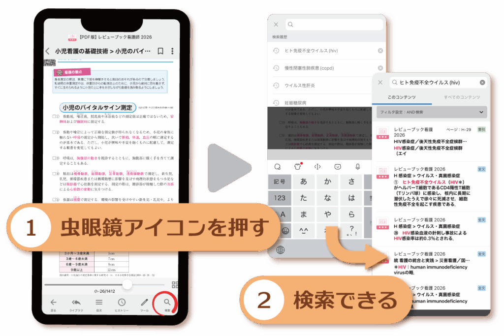 HTML版と同じく、PDF版でも検索機能が使えます。 書籍内のキーワード検索はもちろん、さらにワンタッチでGoogle検索や『看護がみえる』『病気がみえる』シリーズへの検索もできるため、もっと詳しく・違う視点でも学びたい!が叶います。
