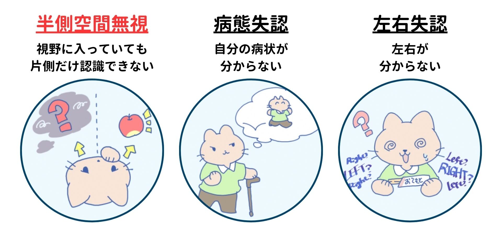 たとえば、半側空間無視目の前のものが視野に入っているにもかかわらず、片側だけ認識できない状態のことで、主に劣位半球(多くは左半球)の頭頂葉の障害によって生じます。ほかにも、自身の病状を認知できない病態失認、左右が分からない左右失認などがあります。