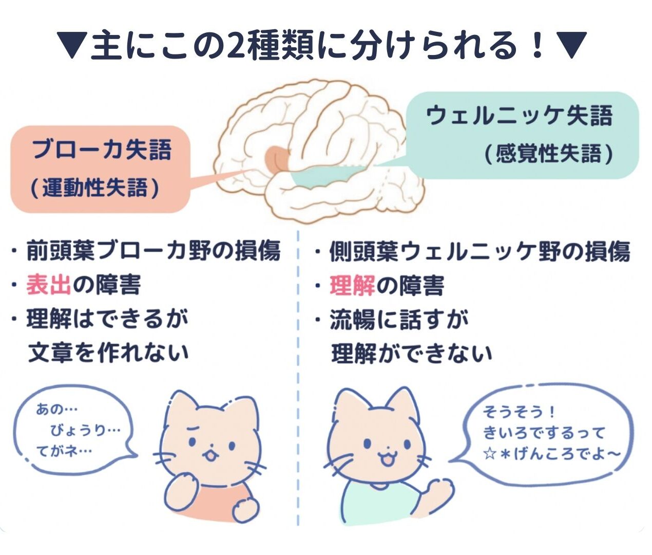 ブローカ失語は、表出の障害で、言語理解は可能ですが(困難な例もみられる)、文章が作れず、適切な言葉で表現することが困難なことが特徴です。対して、ウェルニッケ失語は、言語理解が不可能ですが、流暢に話すことができ、新造語を使って話すことが特徴です。